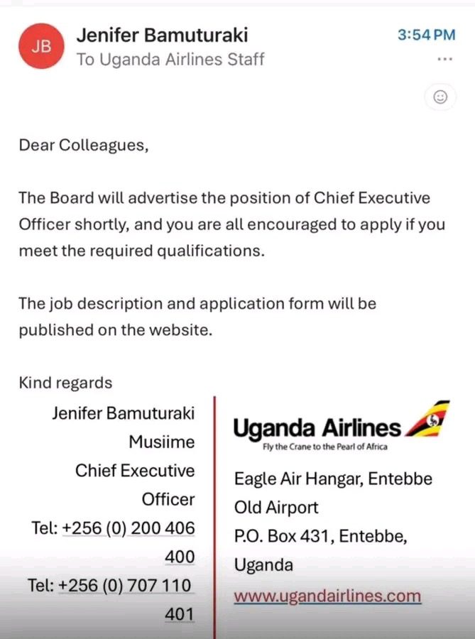 After close to four years at the helm, Jenifer Bamuturaki has confirmed she is stepping down as Chief Executive Officer of Uganda Airlines. In an internal email sent to staff and later leaked, she shared the news calmly: “the Board plans to advertise the CEO position soon.” She encouraged qualified colleagues to watch for the advert, apply if they meet the criteria, and noted that the full job description and application details would appear on the airline’s website.