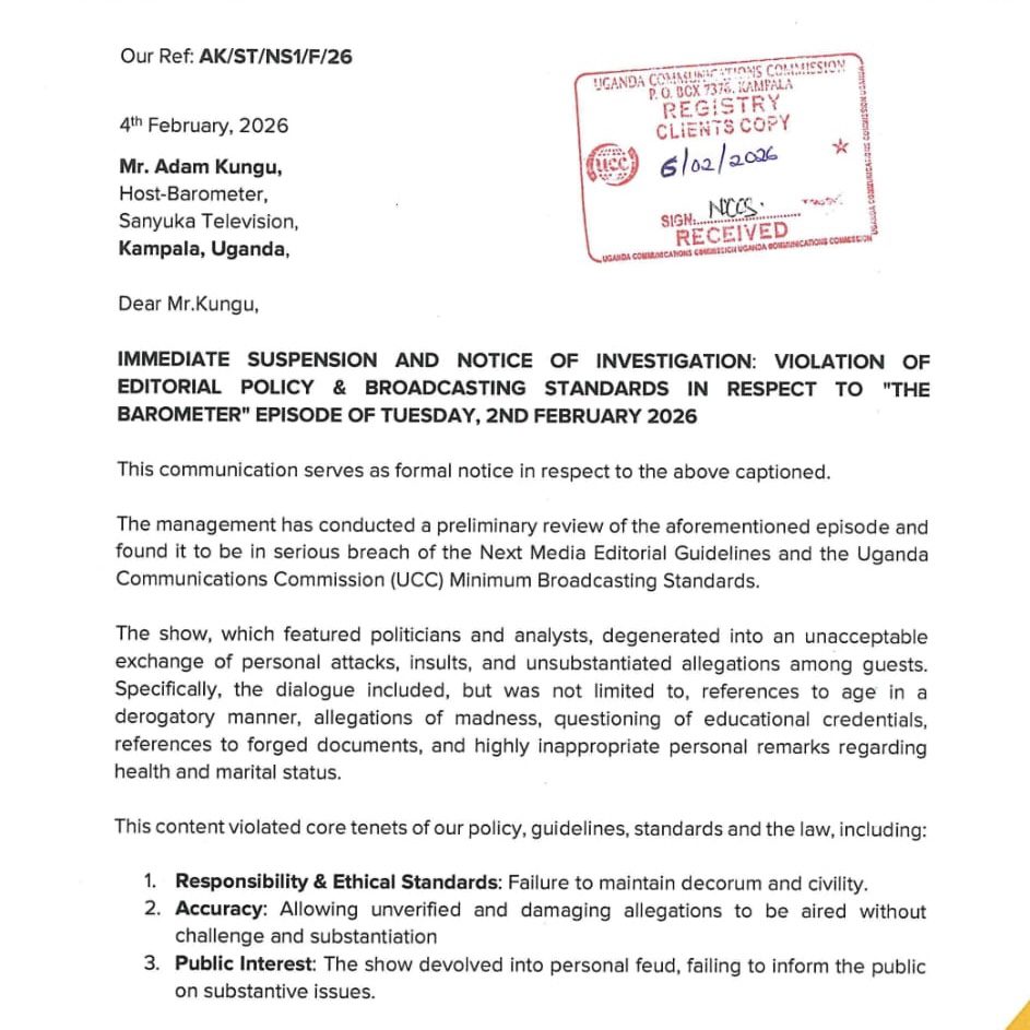 In a sharp regulatory move, the Uganda Communications Commission (UCC) has slapped a suspension on NBS Television presenter Adam Kungu, barring him from helming The Barometer following a chaotic February 2, 2026 episode that devolved into a barrage of personal insults, age-shaming, mental health jabs, forged document accusations, and crude digs at guests’ health and marriages.