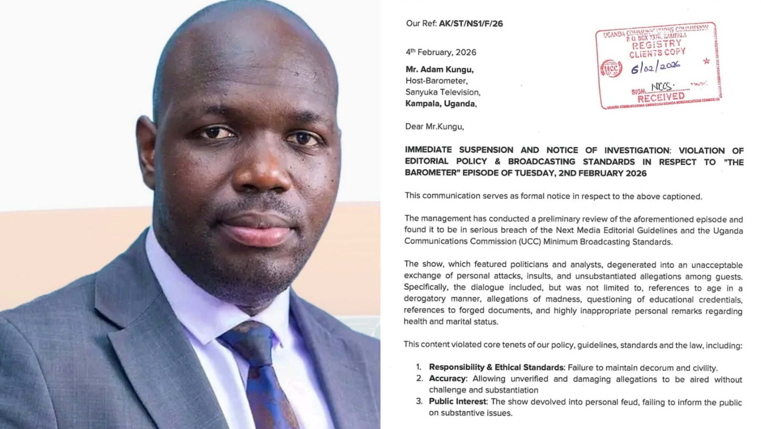 NBS host Adam Kungu suspended by UCC after The Barometer episode with Justine Nameere turns into personal attacks, insults, and breaches of broadcasting standards on ethics, accuracy, and public morality.