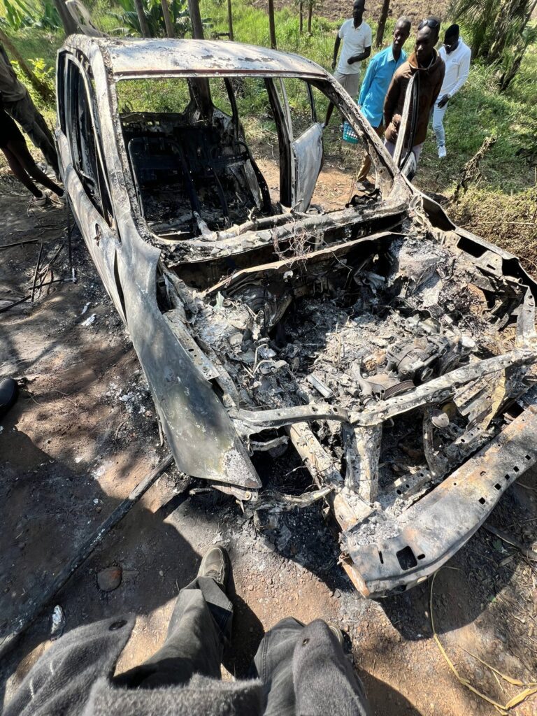 The incident unfolded on Sunday, March 8, 2026, as they made their way back to Kampala following a successful performance in Fort Portal. Reports indicate the car suddenly caught fire, forcing the driver to pull over in a desperate bid to control the blaze. Despite attempts to put out the flames, the fire raged on, reducing the vehicle to a charred wreck.
