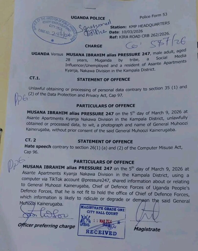 Appearing before the magistrate today, March 11, 2026, Pressure 24/7 faced charges pertaining to accessing and publishing personal data without authority, as well as charges of hate speech. Dressed in a prison uniform, the digital creator pleaded not guilty to all counts.Despite his plea, the presiding magistrate denied bail and remanded the accused to the custody of Luzira Prison, where he will remain until the next hearing.