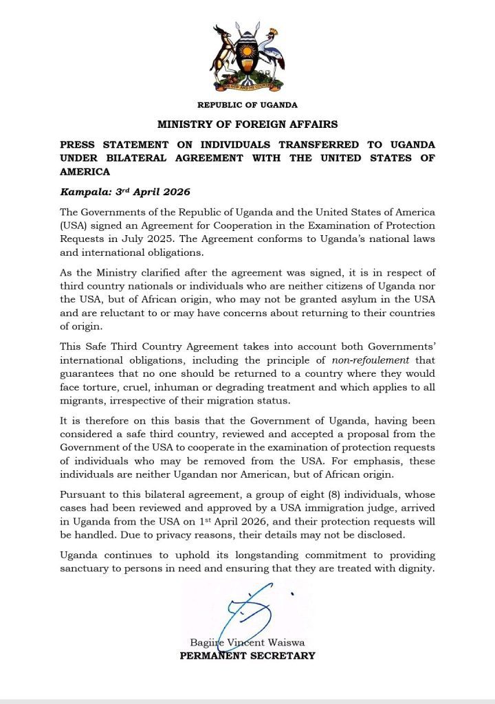 In a press statement released Friday, April 3, 2026, Permanent Secretary Bagiire Vincent Waiswa revealed that eight individuals arrived in the country on April 1. The transfer marks the first practical implementation of the “Agreement for Cooperation in the Examination of Protection Requests,” which was formalized between Kampala and Washington in July 2025.