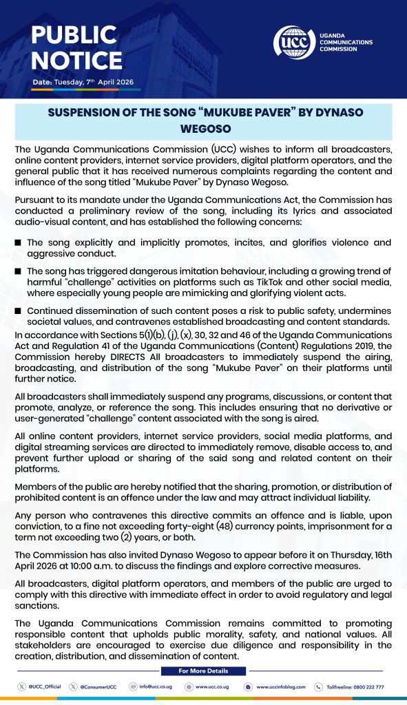Uganda Communications Commission (UCC) has issued an immediate nationwide suspension of the song “Mukube Paver” by artist Dynaso Wegoso following a flood of public complaints over its violent content and the dangerous social media challenges it has sparked.In an official Public Notice dated Tuesday, 7th April 2026, the regulator stated that after a preliminary review of the song’s lyrics and audio-visual material, it found the track explicitly and implicitly promotes, incites, and glorifies violence and aggressive behaviour.